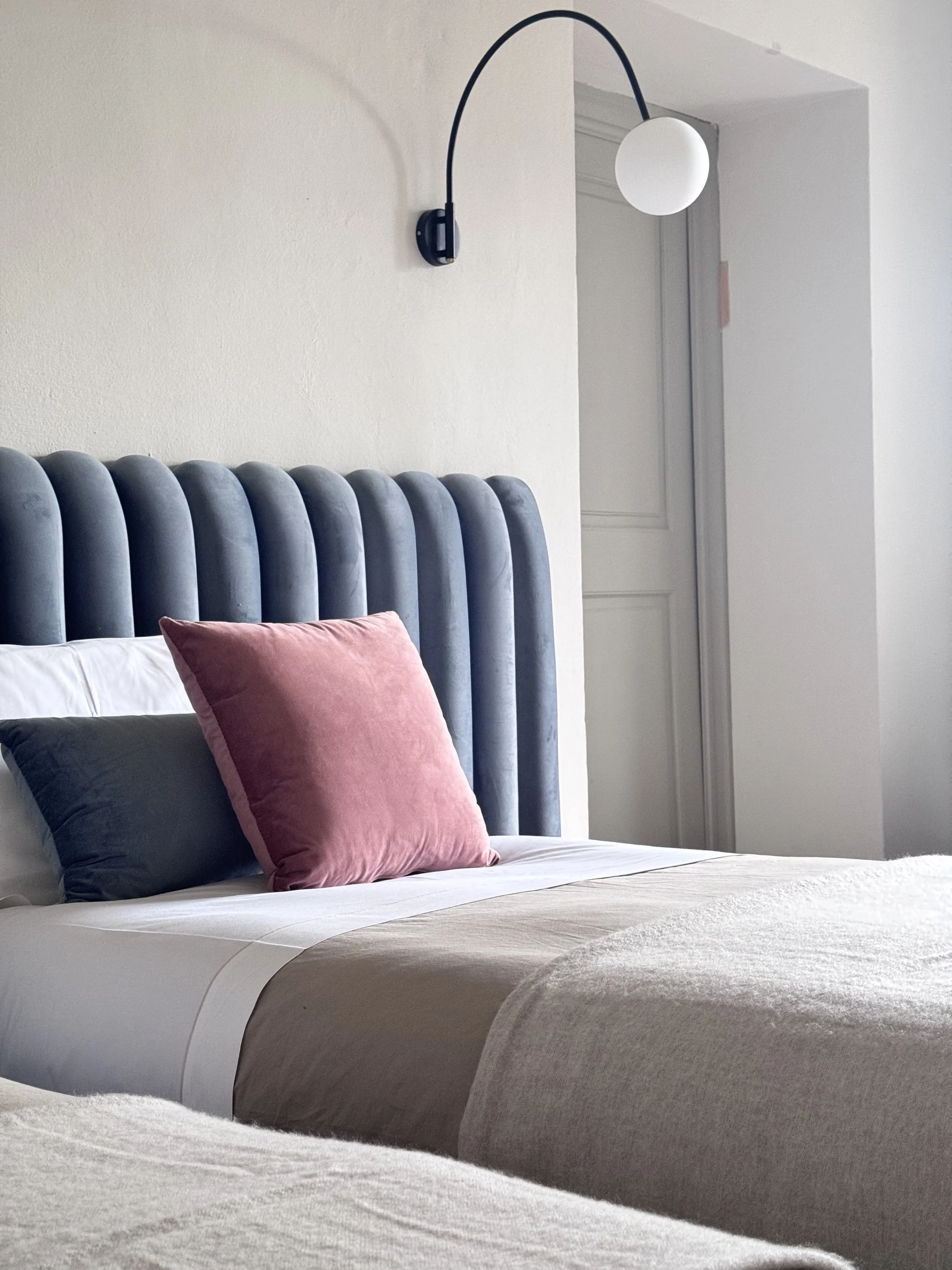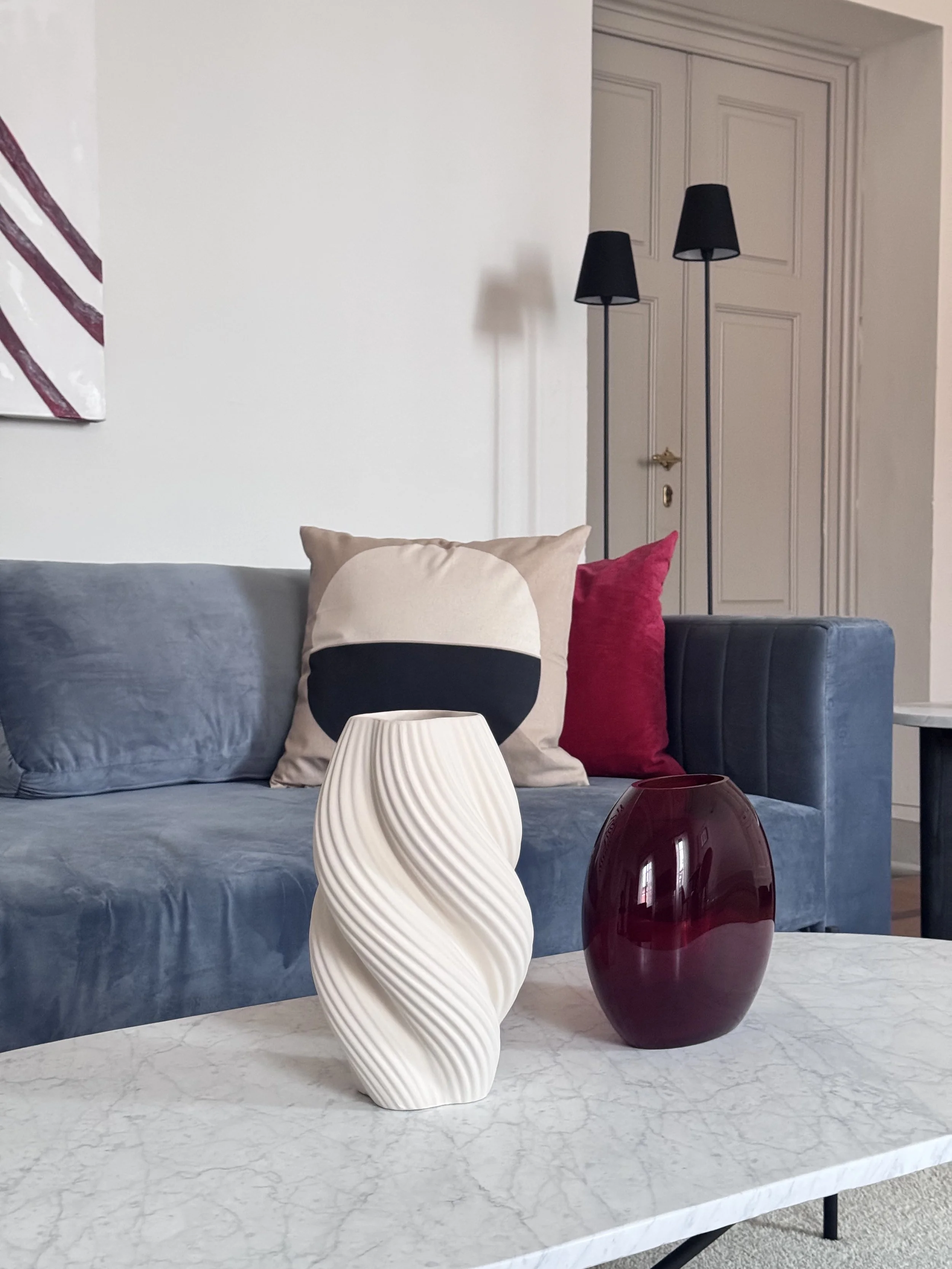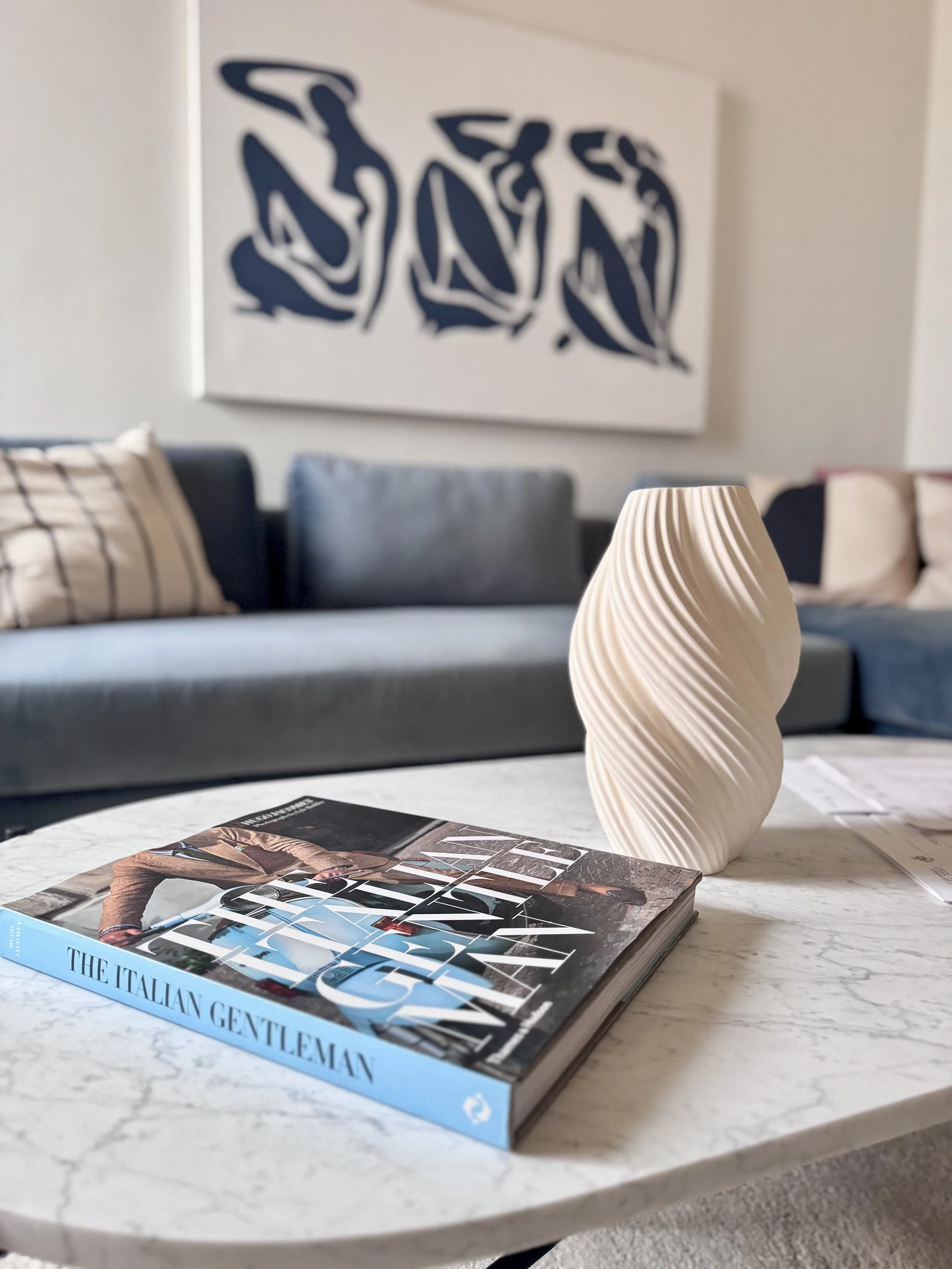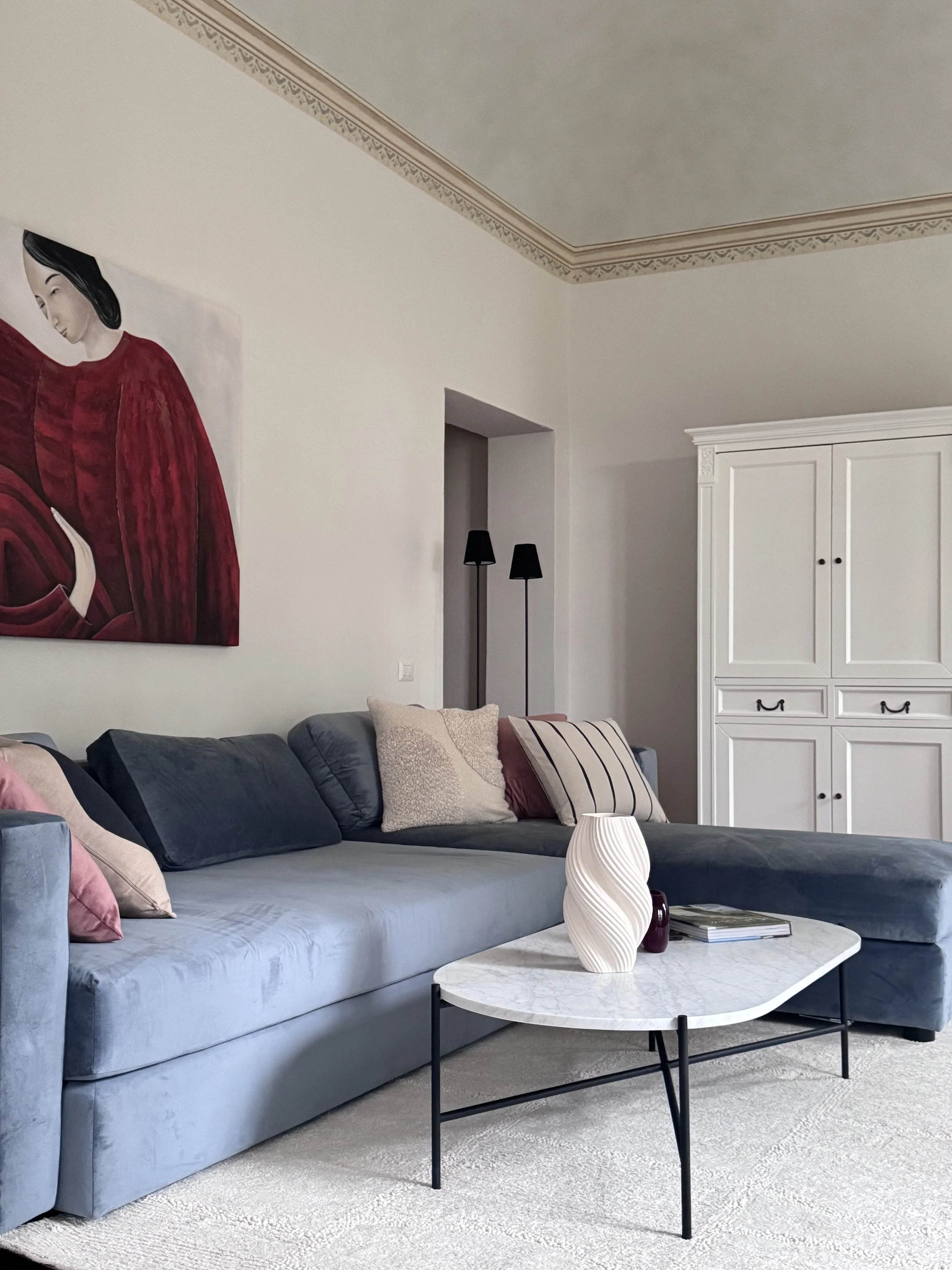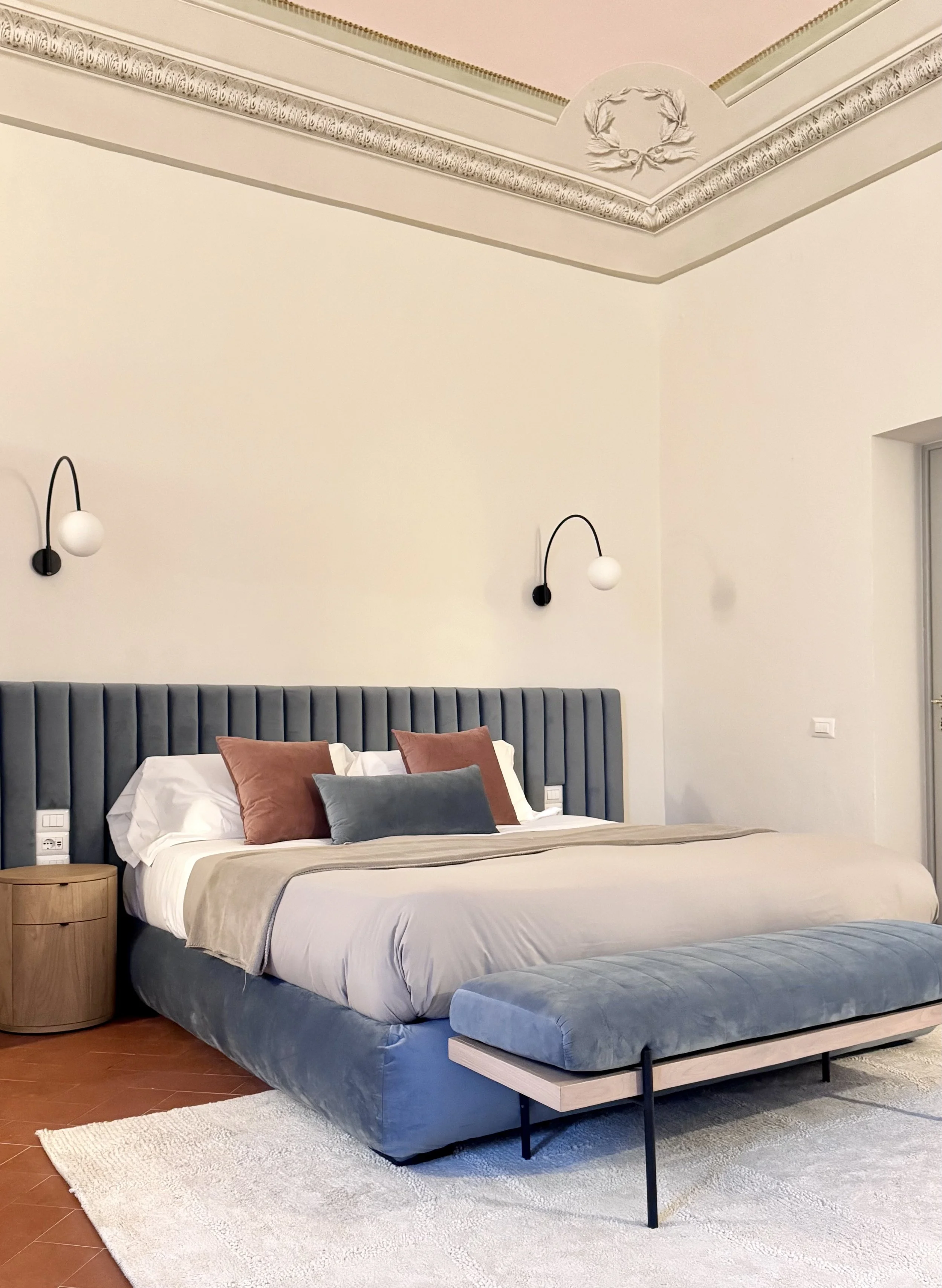 We celebrated the intersection of old and new through high-end custom Italian furniture featuring hand-finished Carrara marble tops and exquisite detailing. Plush blue velvet upholstery on bespoke sofas and beds provides sumptuous comfort, while black burnt timber accents and bold red-toned Murano glass vases create a rich, layered contrast against the classical frescoes and architectural details.