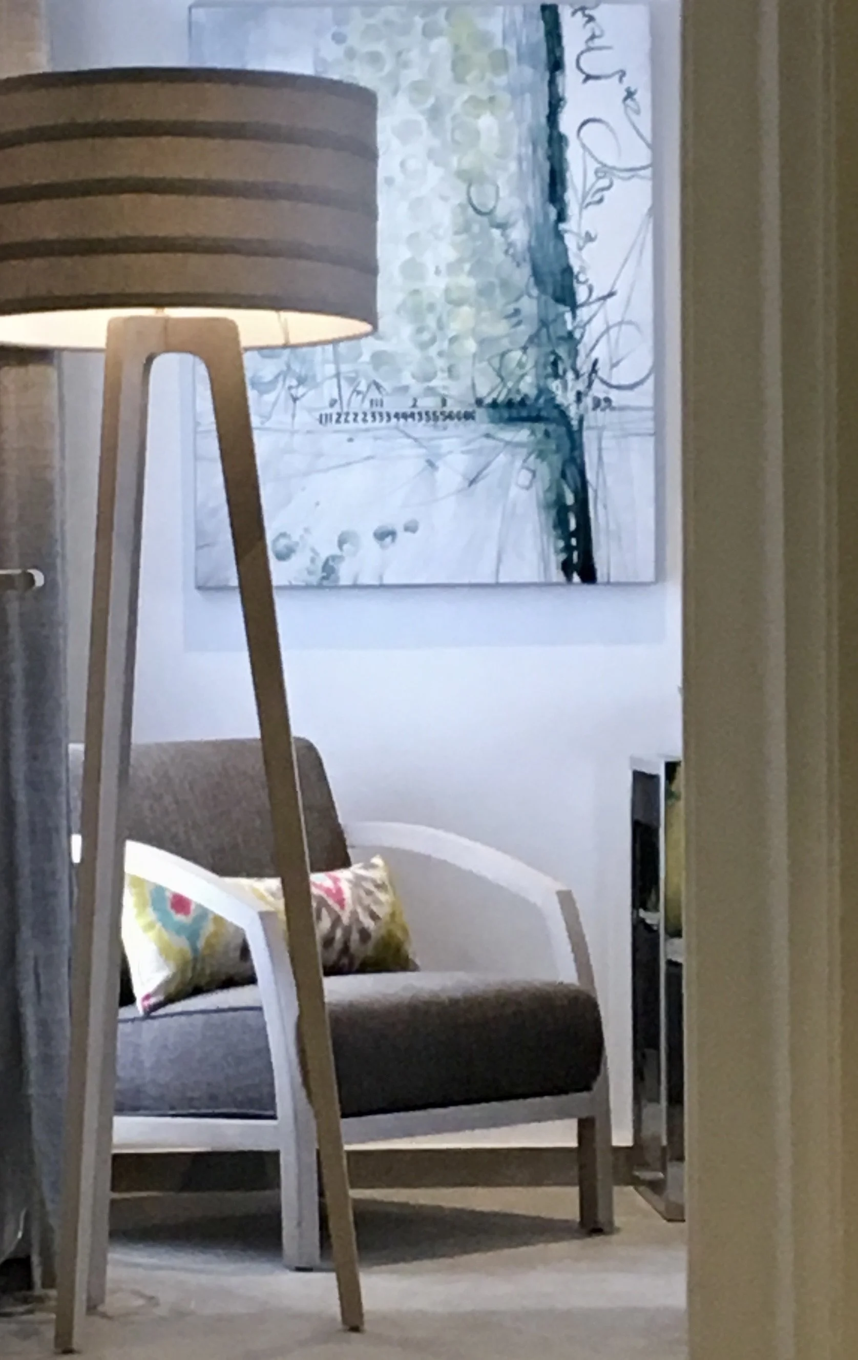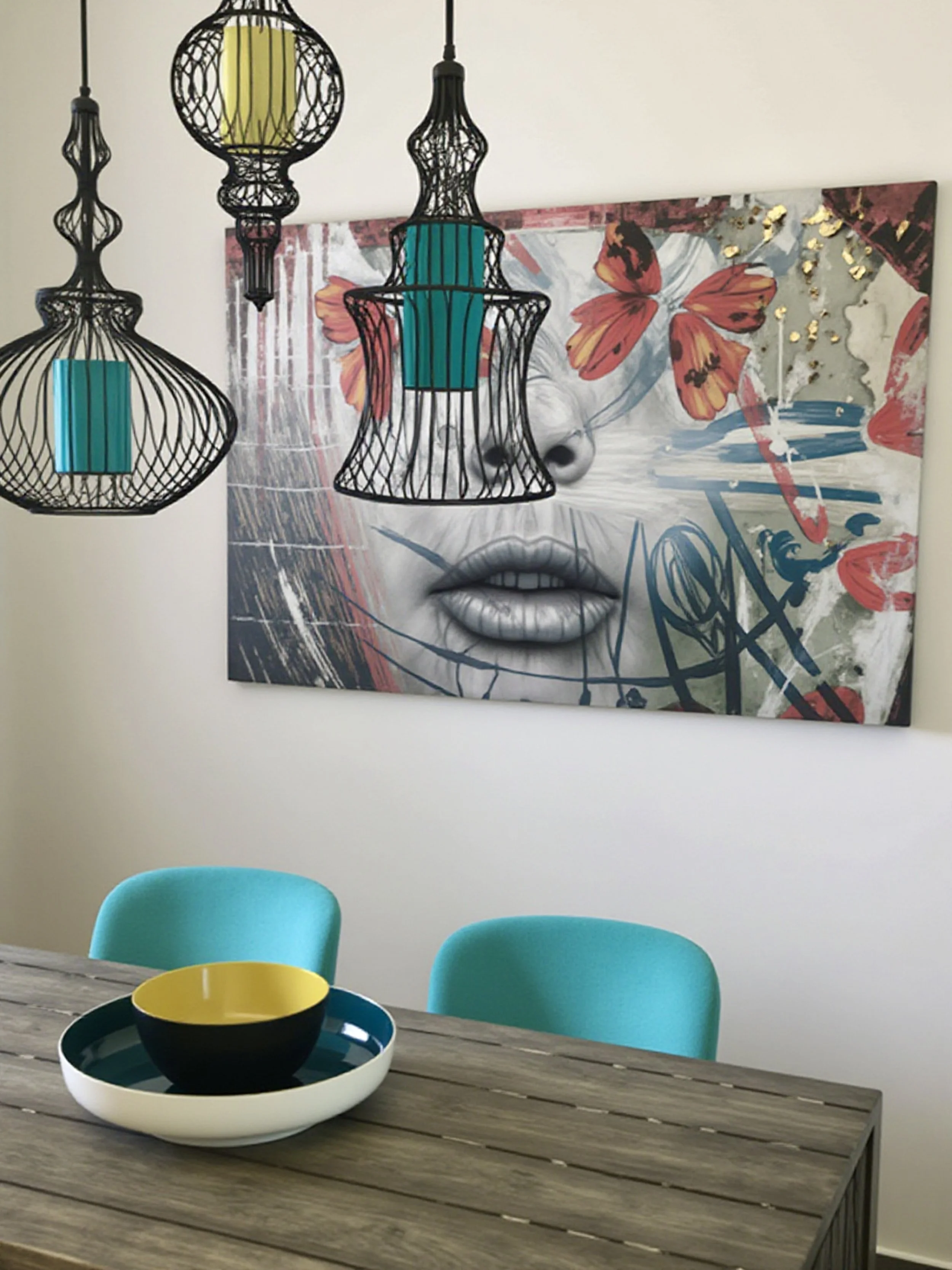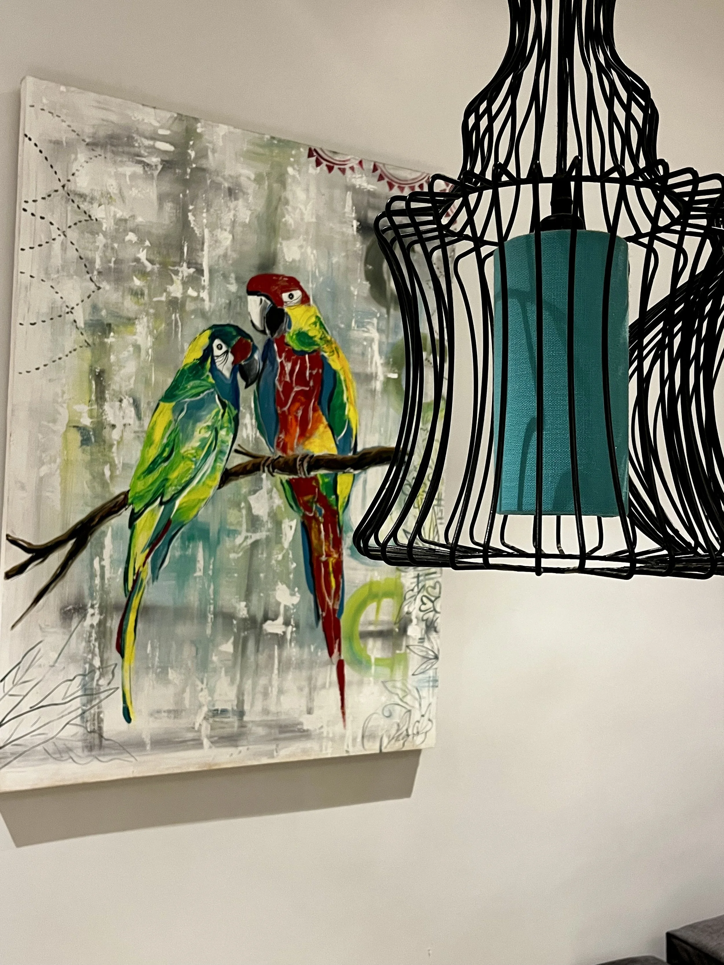 Key Materials: Bright Color Fabrics, Cage-Style Pendant Lamps, Custom Artwork