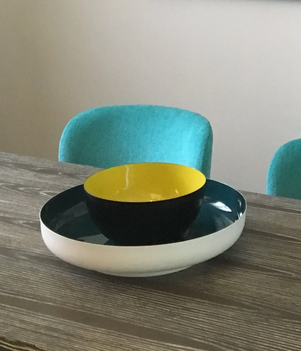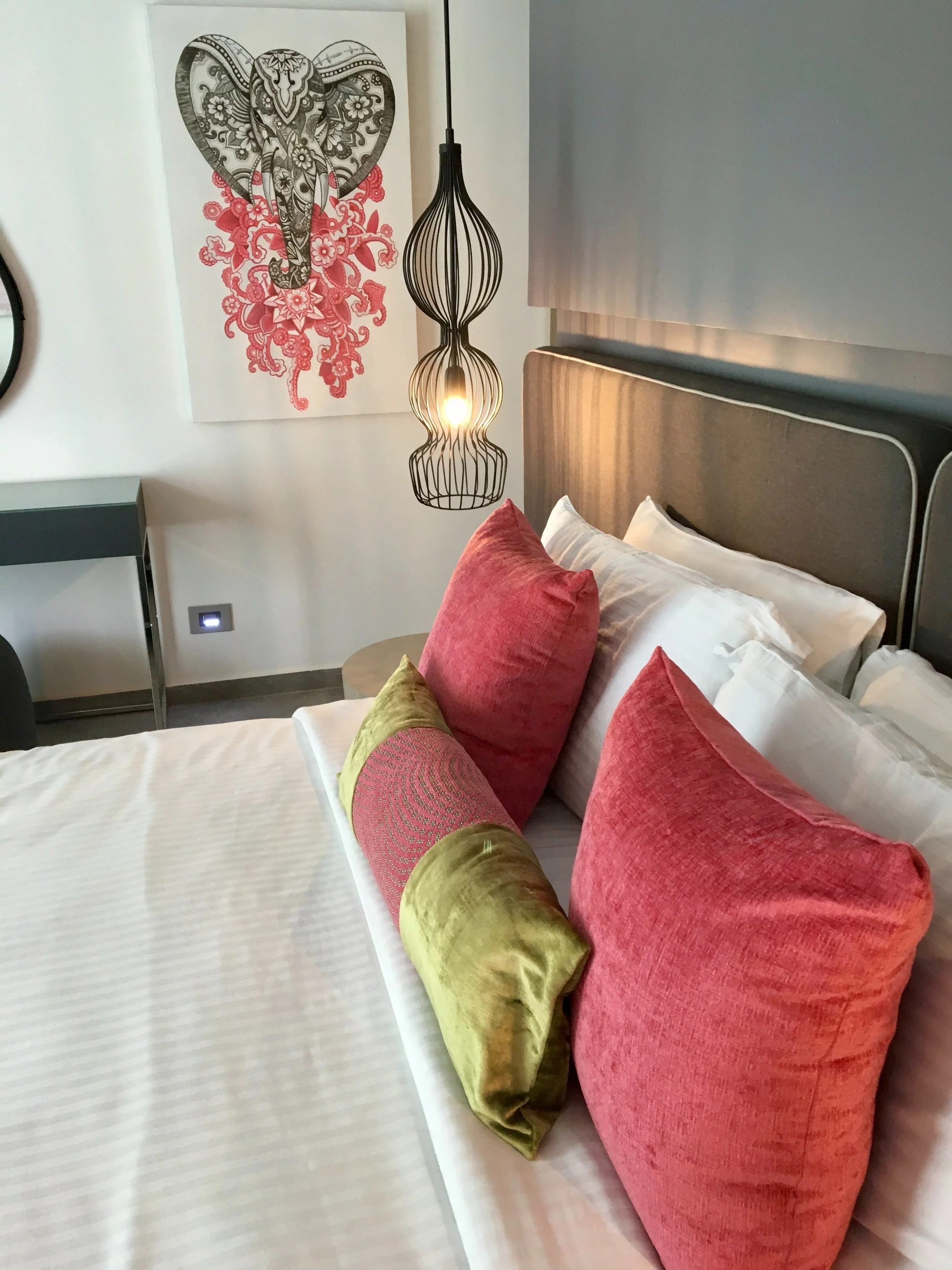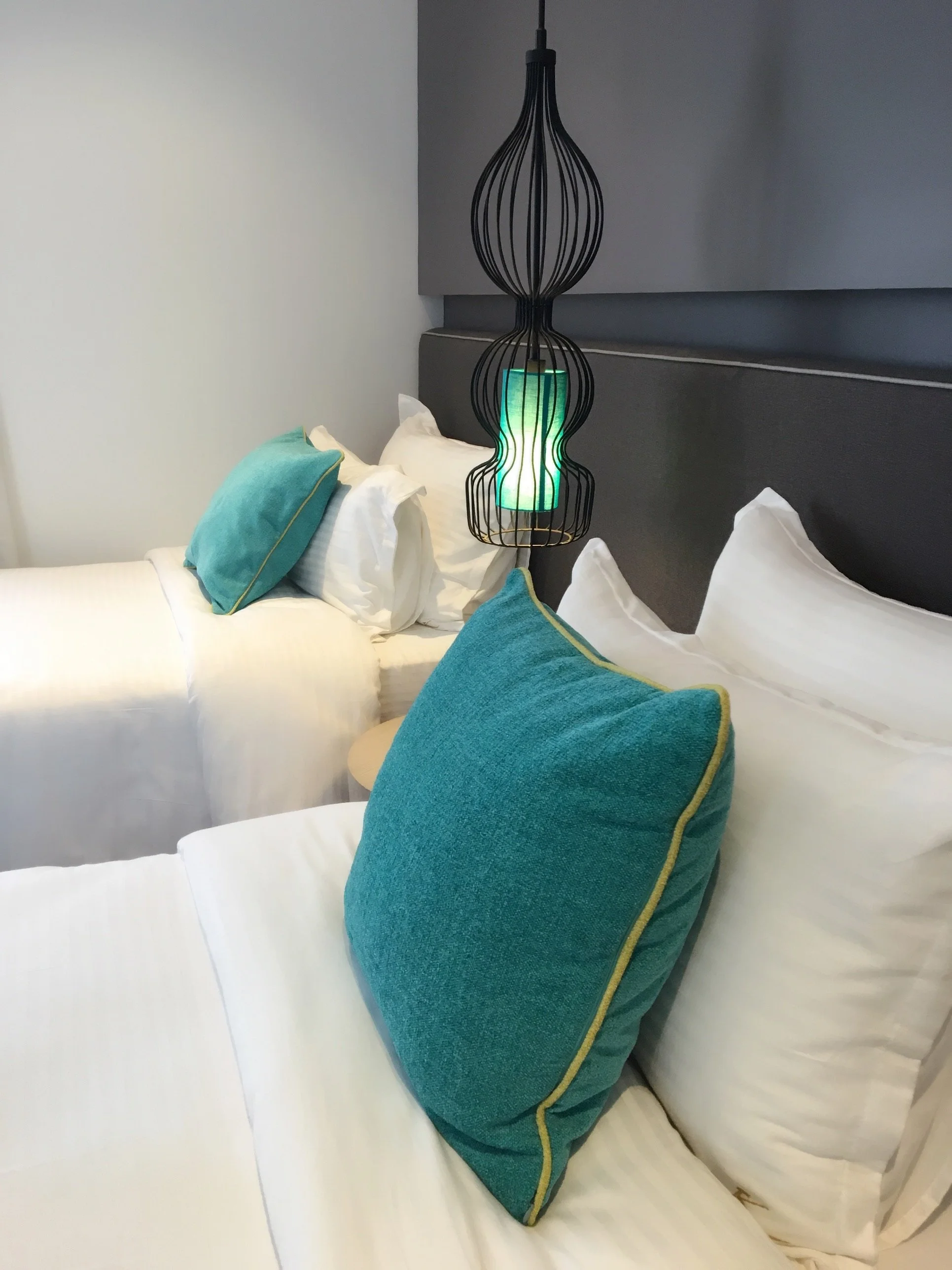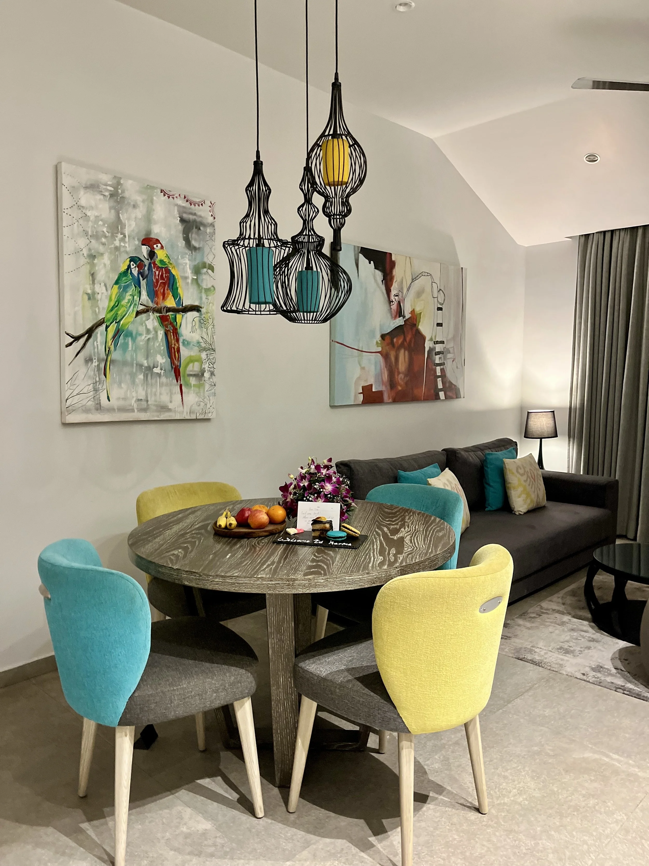 We embraced India's love of color through a carefully curated palette of vibrant turquoise, bright lime yellow and strawberry pink fabrics, set against a foundation of clean grey tones for balance. Custom cage-style metal pendant lamps, finished in matching turquoise, create a cohesive dining experience with the upholstered chairs. This colorful narrative continues into bold contemporary artwork that echoes the same energetic palette throughout each space.