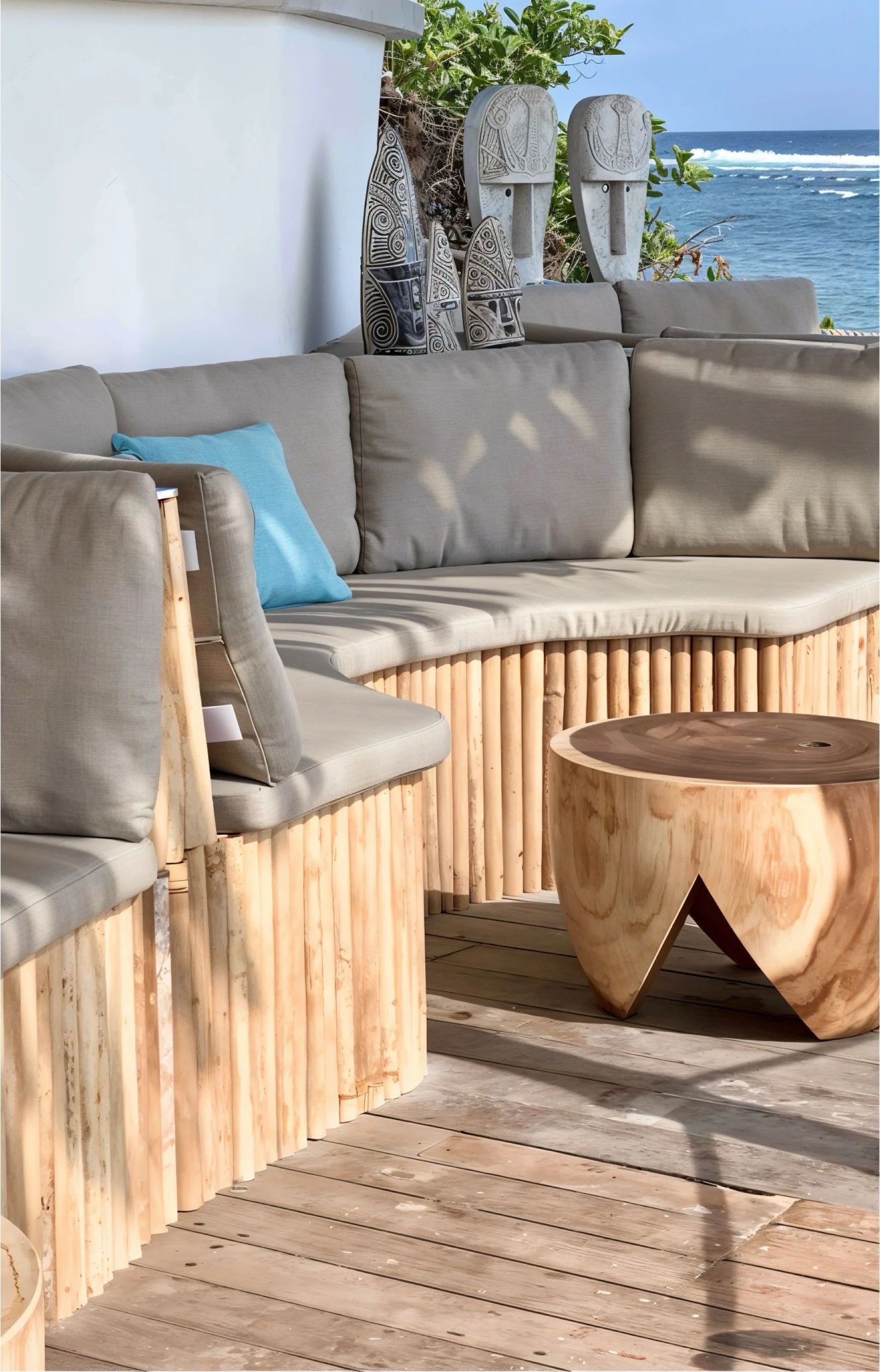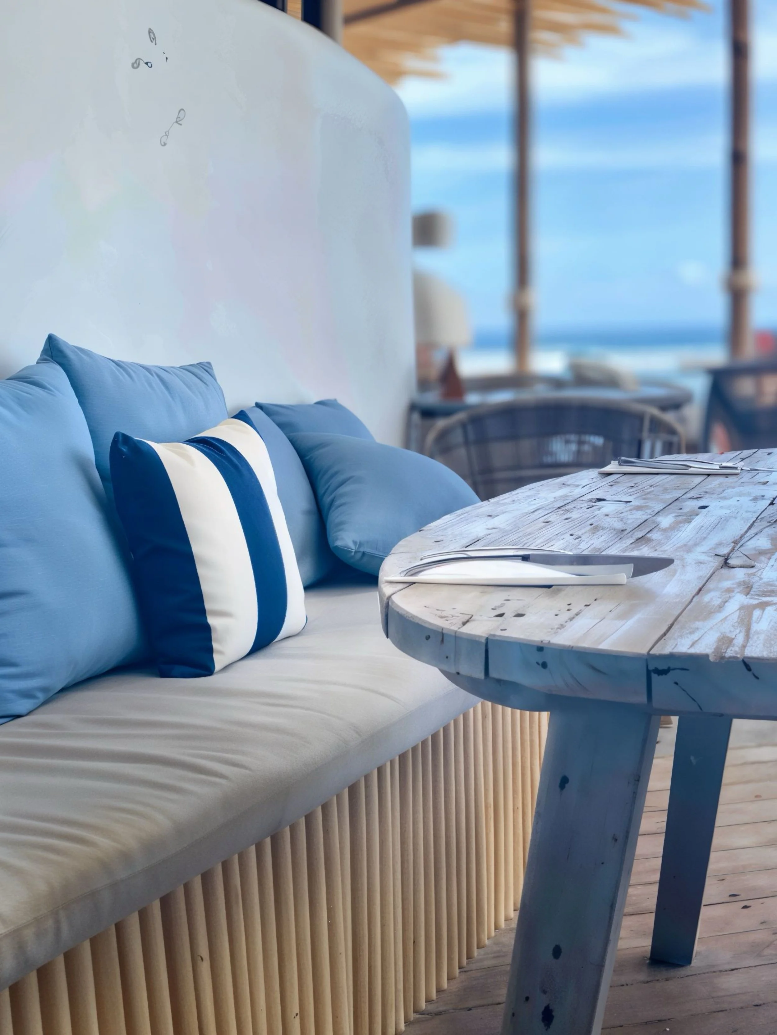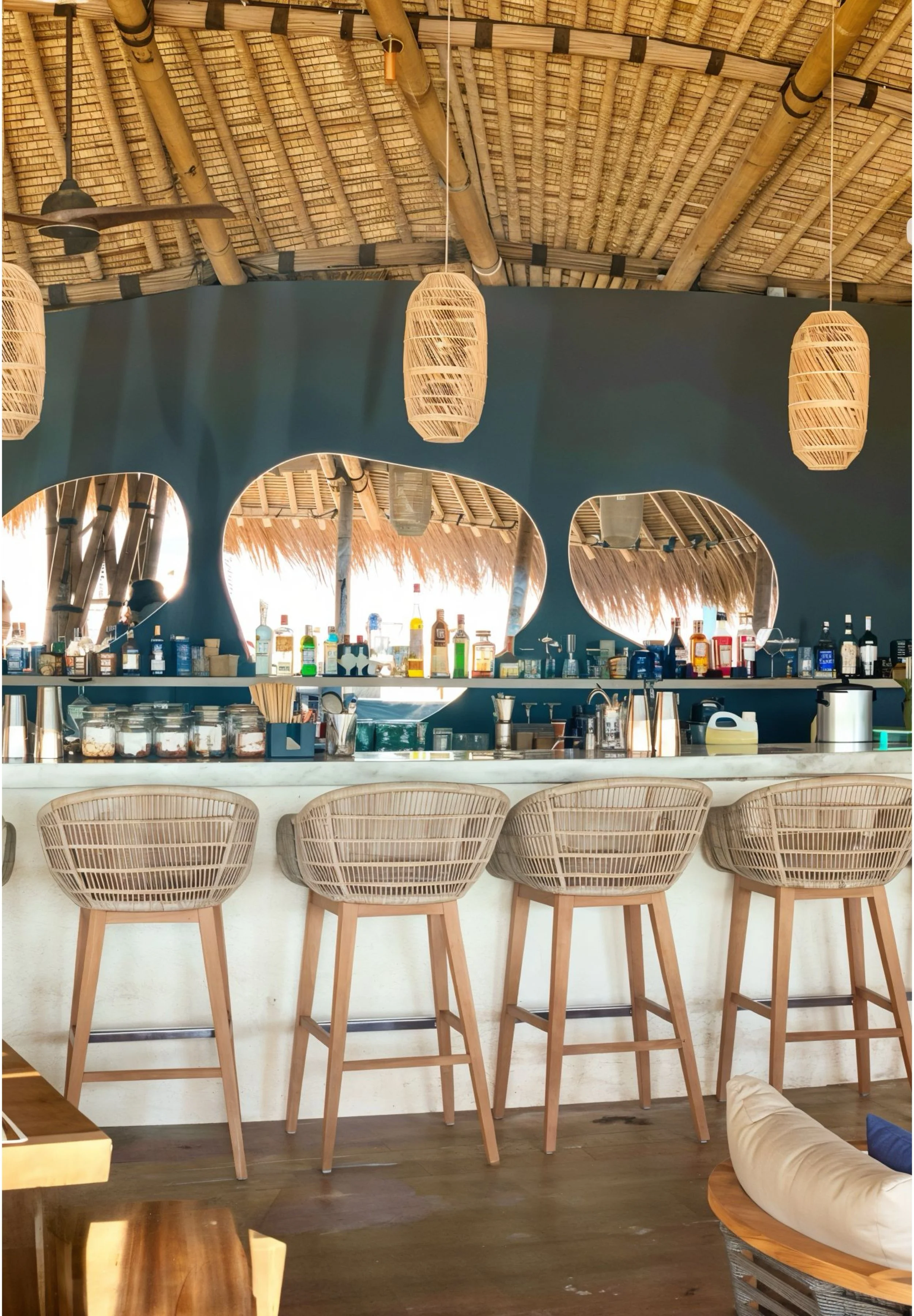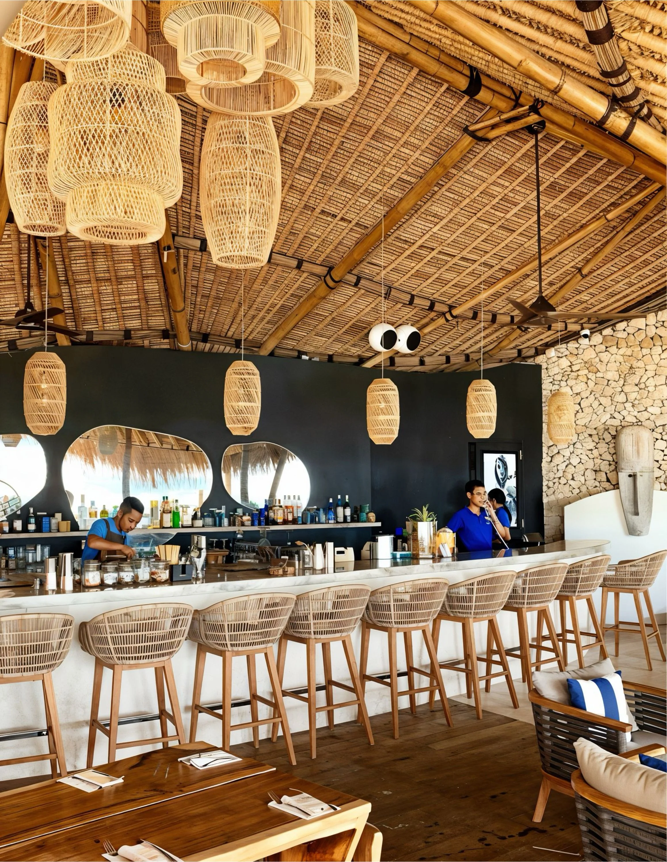 We crafted an organic, flowing layout using natural teak and rope details to define each zone. Dramatic arched openings framed the iconic ocean views, while handcrafted rattan lamps and carved wooden wall art added layers of authentic texture. Organic-shaped mirrors enhanced the bright, airy atmosphere throughout the large bar, pizza area, and beach lounges.