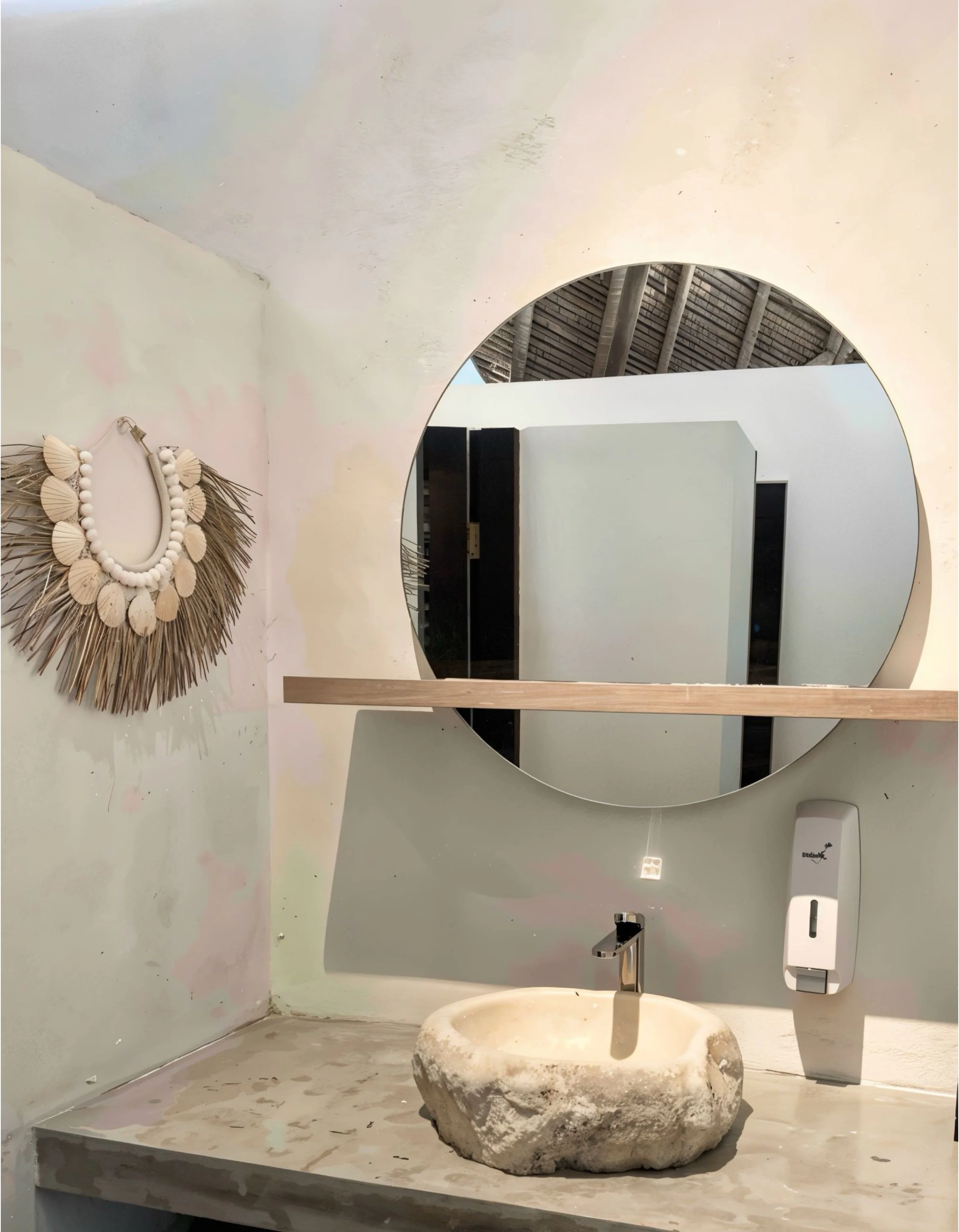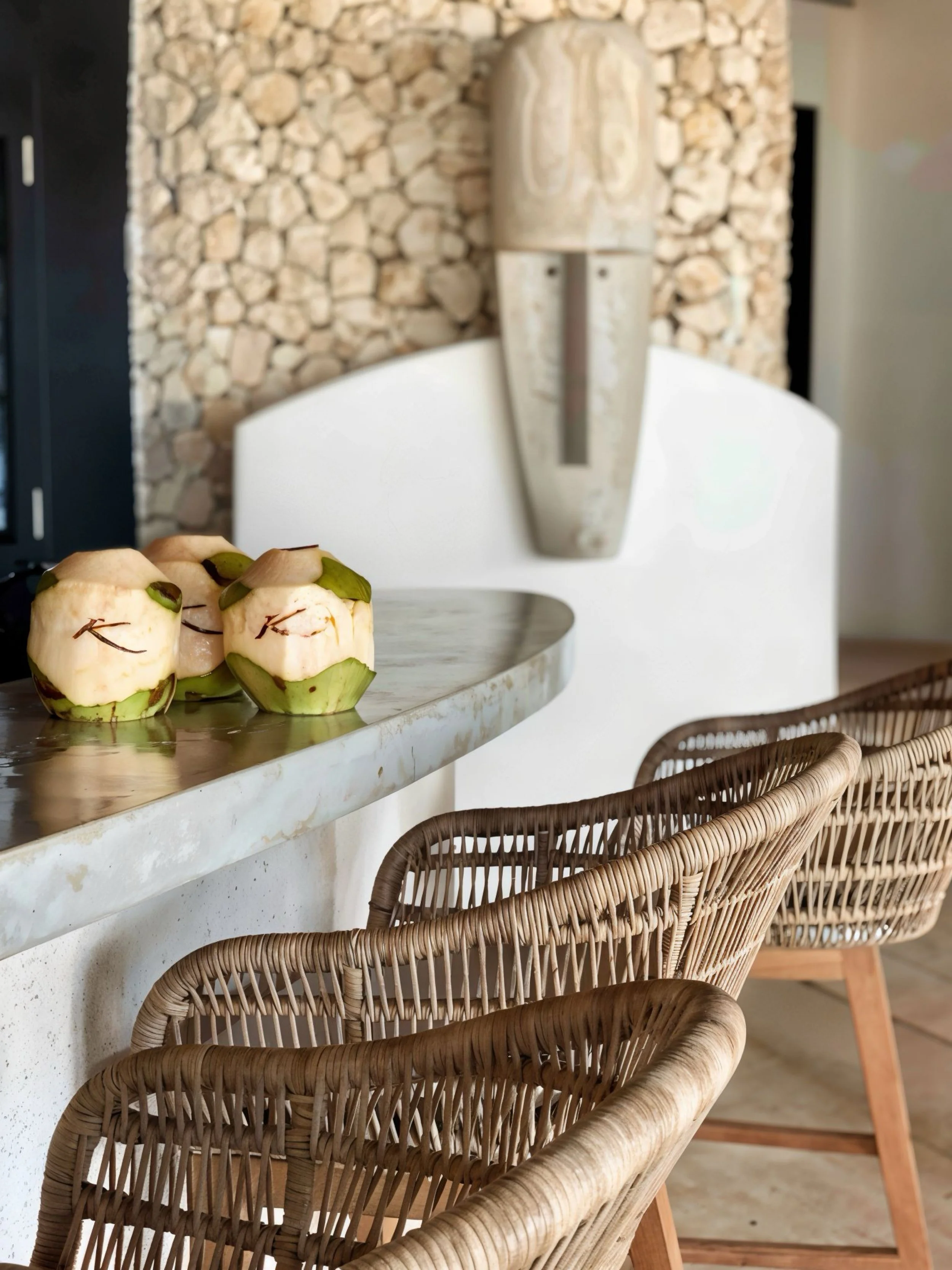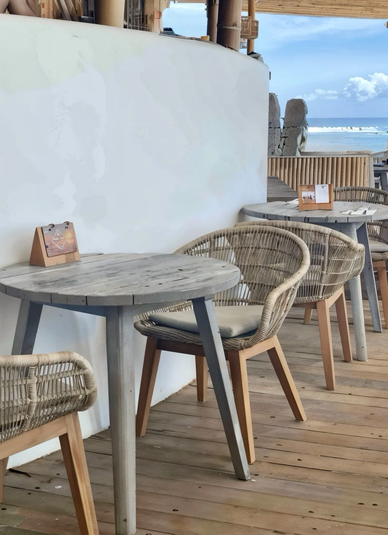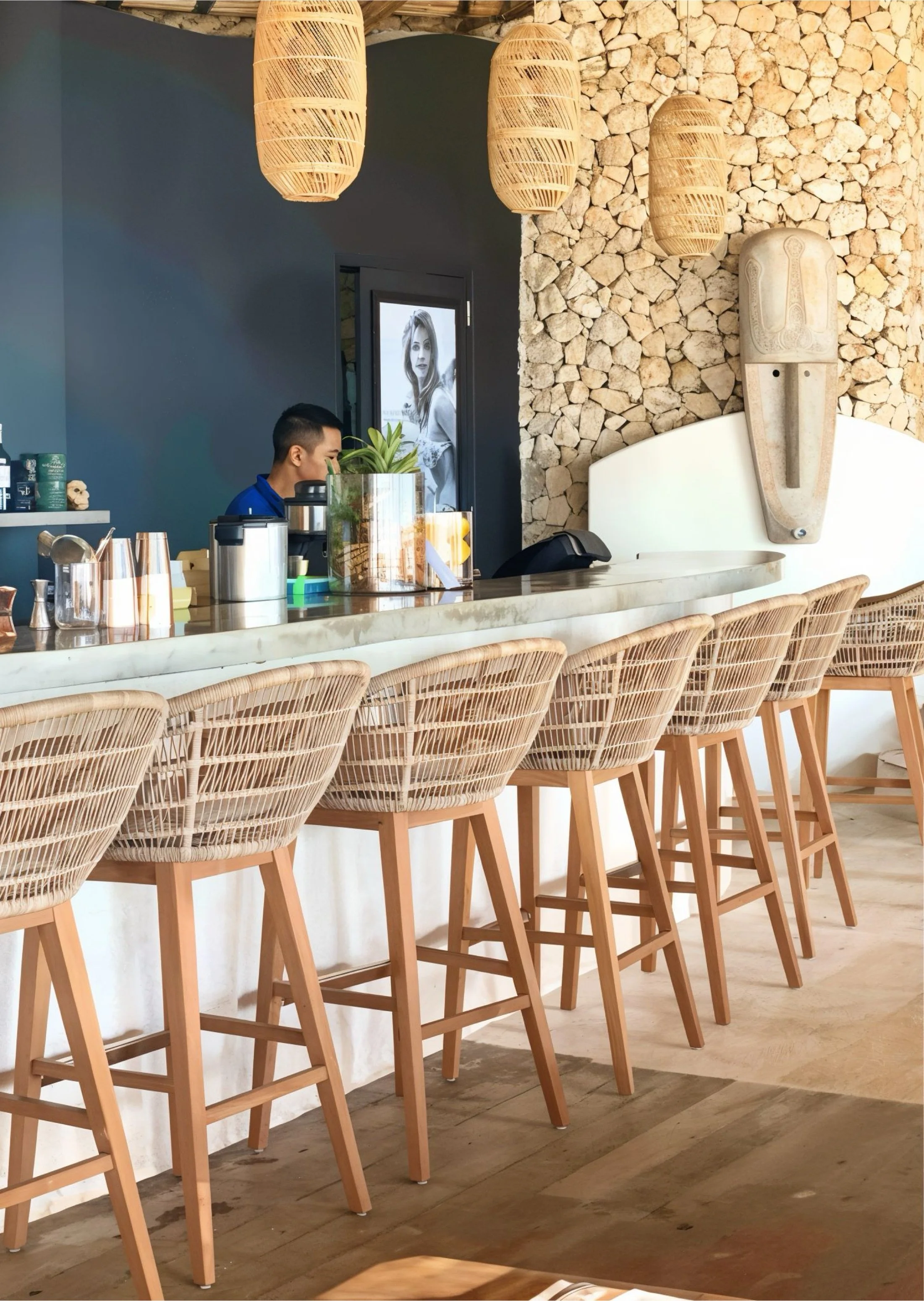 We crafted an organic, flowing layout using natural teak and rope details to define each zone. Dramatic arched openings framed the iconic ocean views, while handcrafted rattan lamps and carved wooden wall art added layers of authentic texture. Organic-shaped mirrors enhanced the bright, airy atmosphere throughout the large bar, pizza area, and beach lounges.