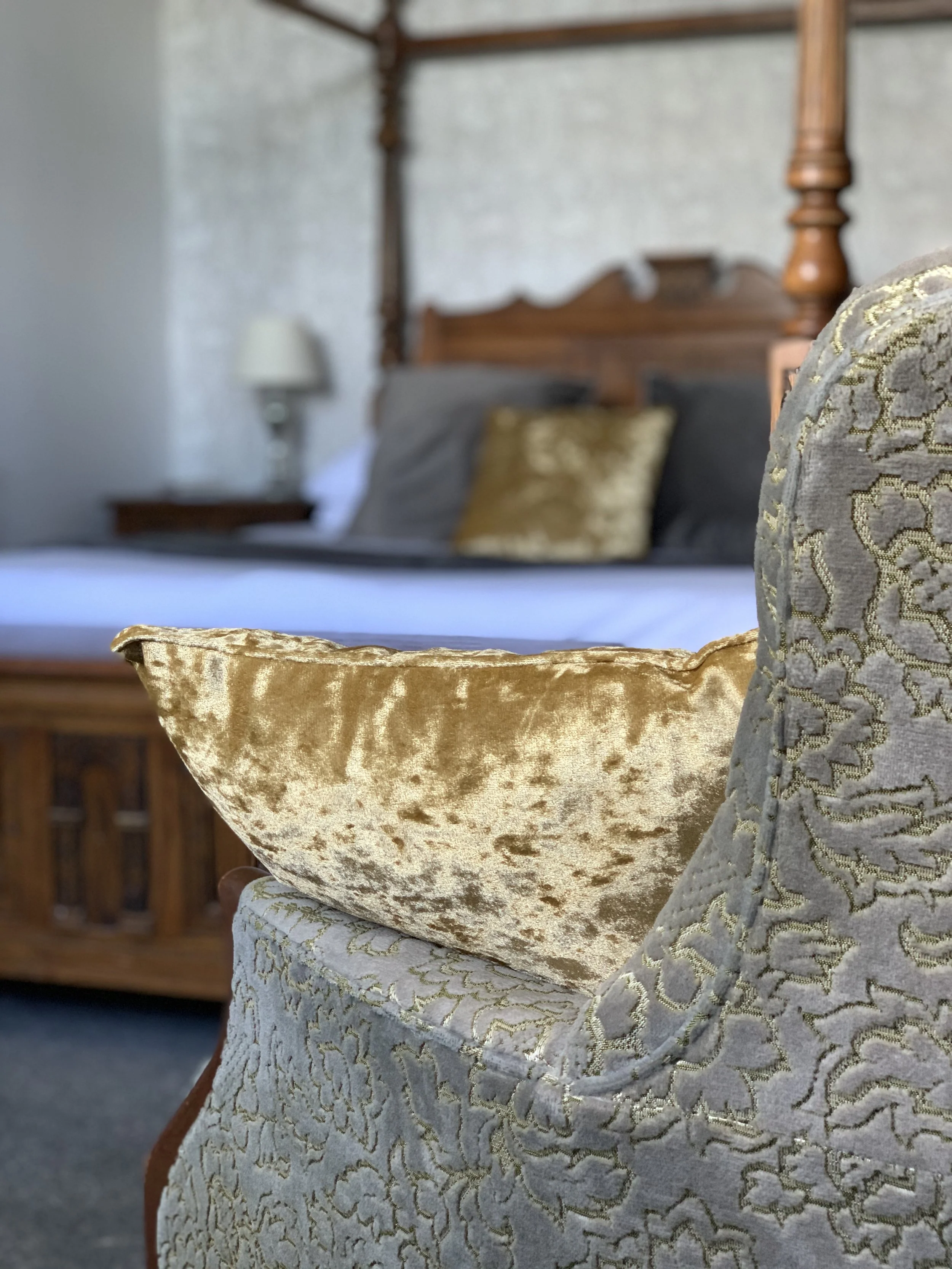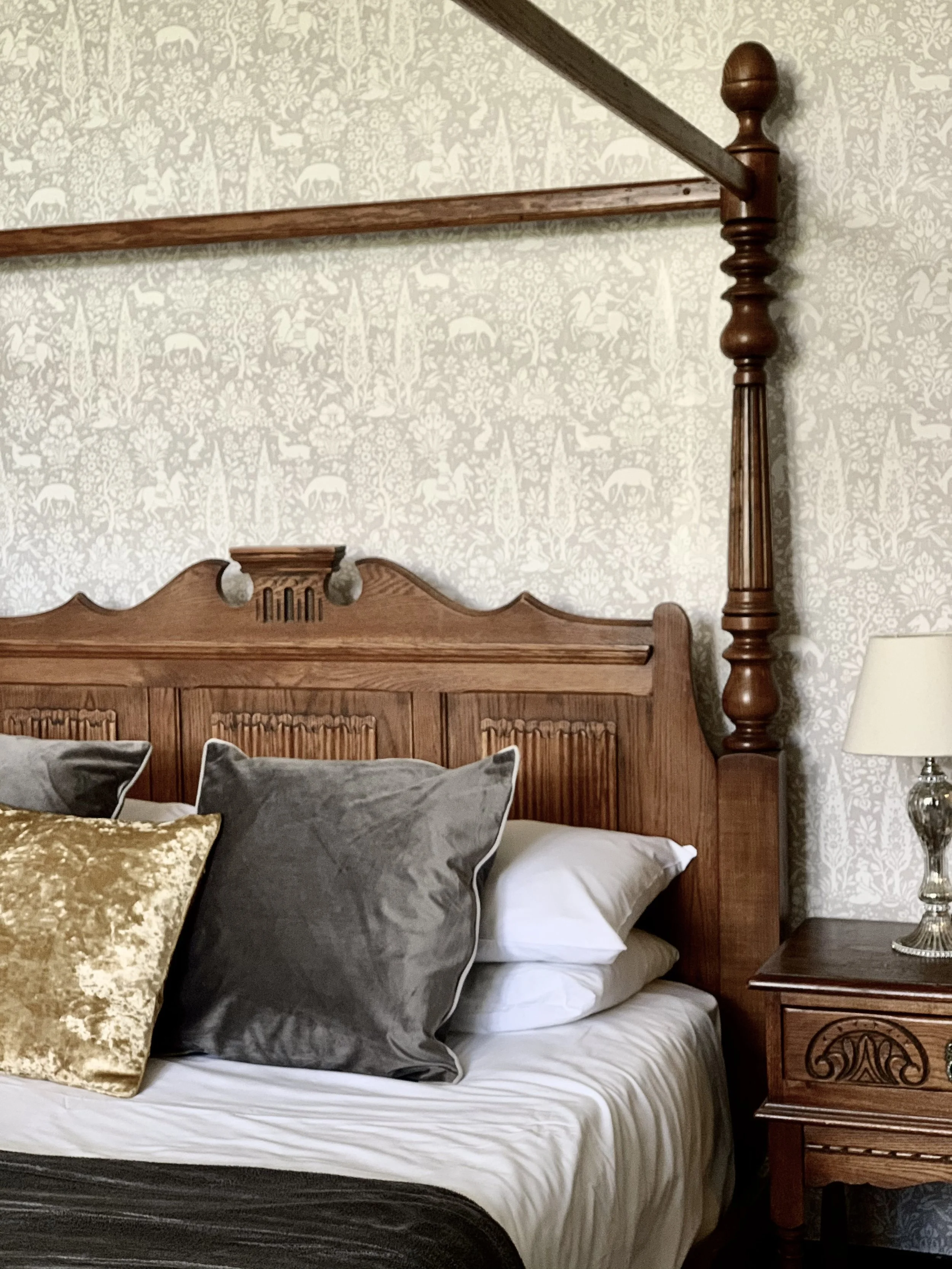 Key Materials: Classic Wallpapers, Spindle Chairs, Gold & Silver Accents. Velvet upholstery