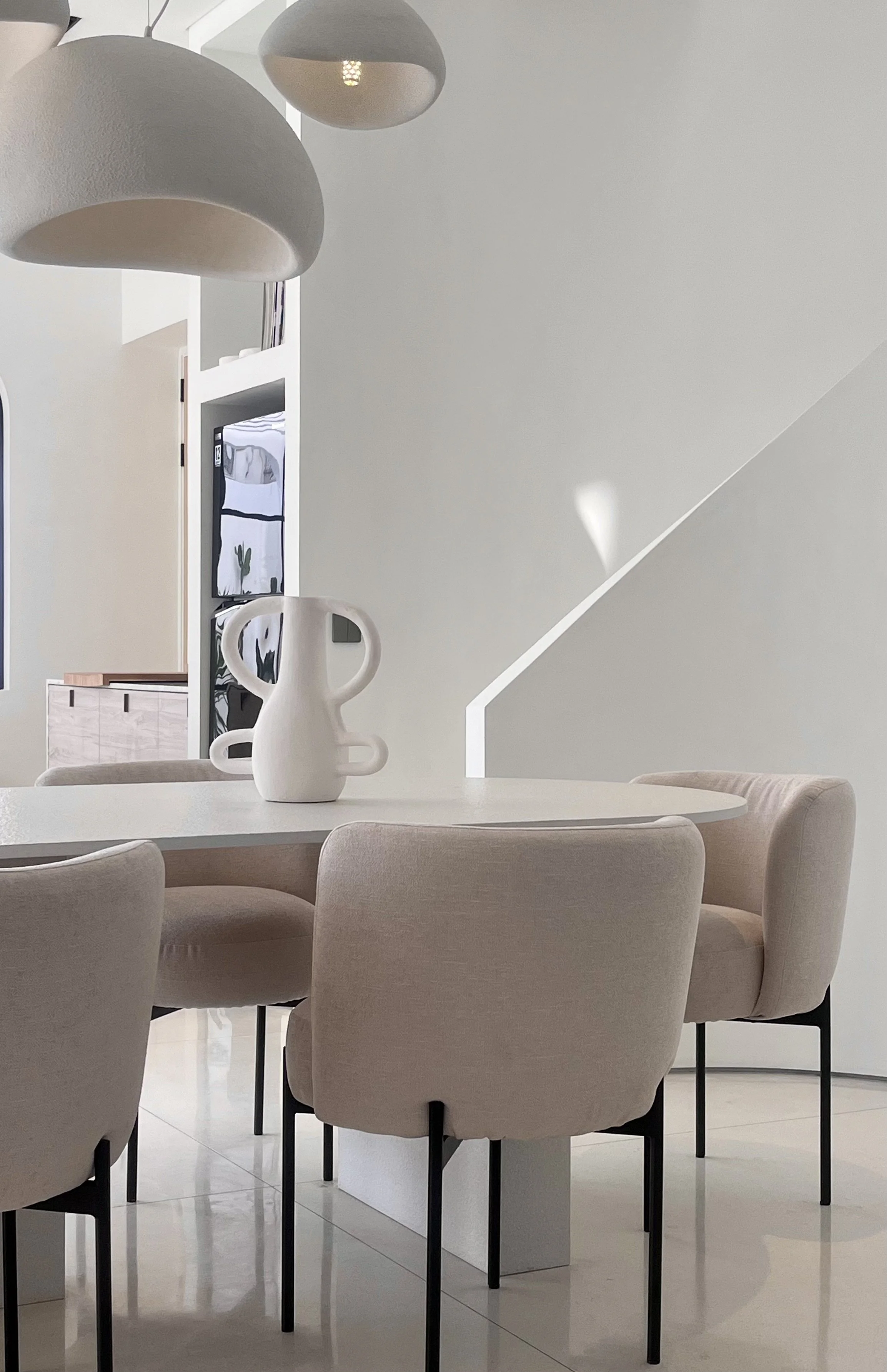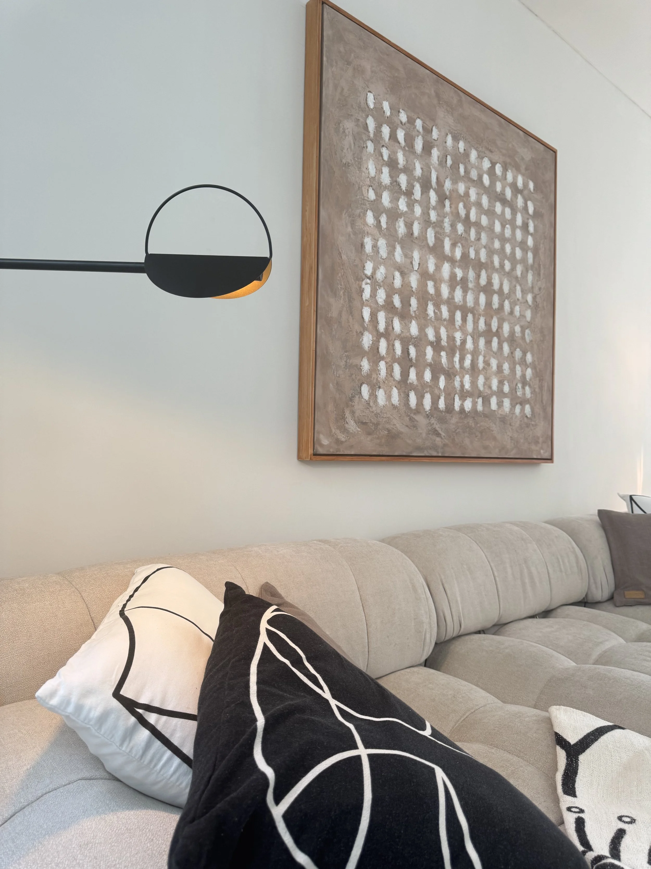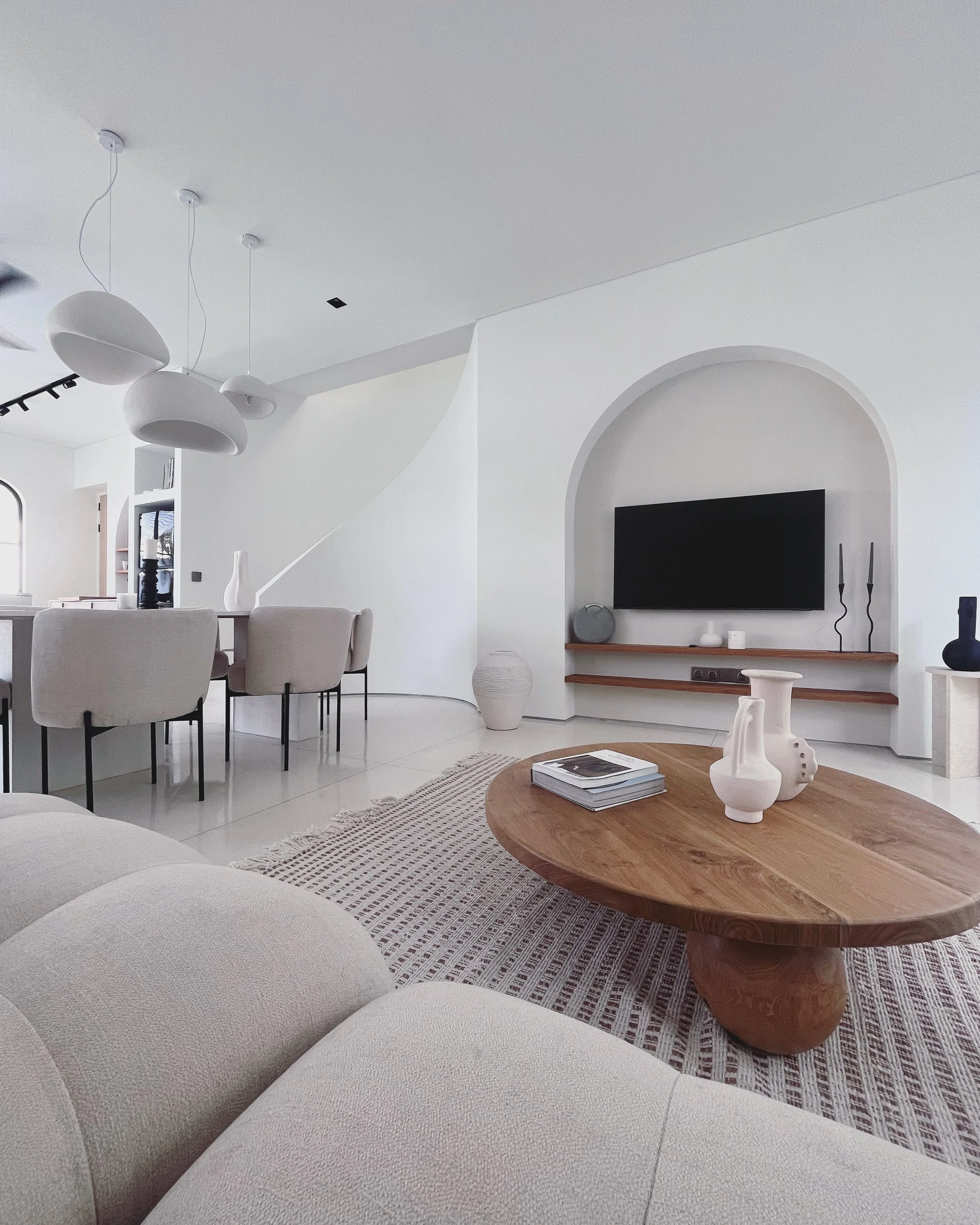 We crafted a serene sanctuary using a sophisticated, light-washed material palette: warm recycled teak, textured off-white linen fabrics, and pale natural stone. This harmonious trinity defines the space, anchored by custom pieces like an extra-deep Bellini sofa and a sleek, light stone dining table.
