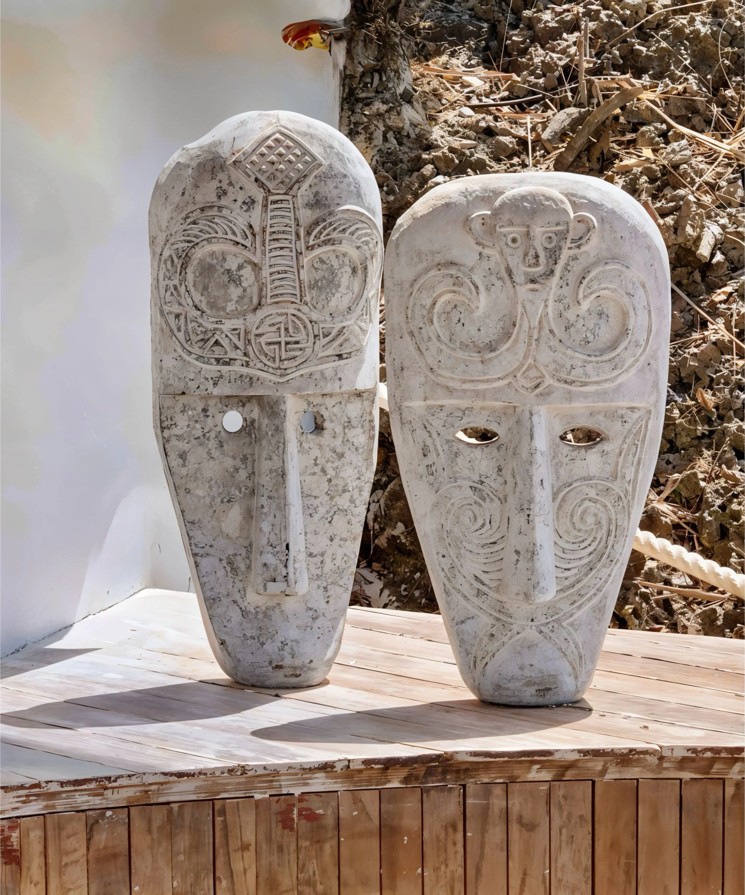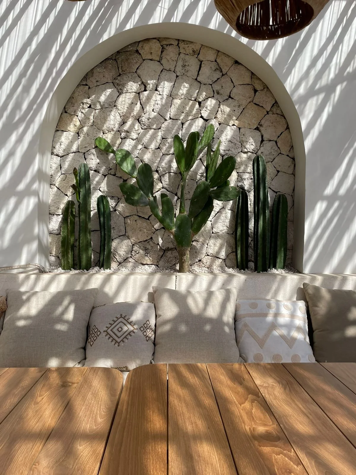 Arched openings were strategically designed to perfectly frame the existing natural rock stone, making the geology itself a living art feature. Woven rattan lamps enhance the organic atmosphere, while curved mirrors and handcrafted artifacts like Timur masks and antique clay vases add layers of artistic character. Drought-resistant cacti complete the coastal-meets-desert atmosphere.