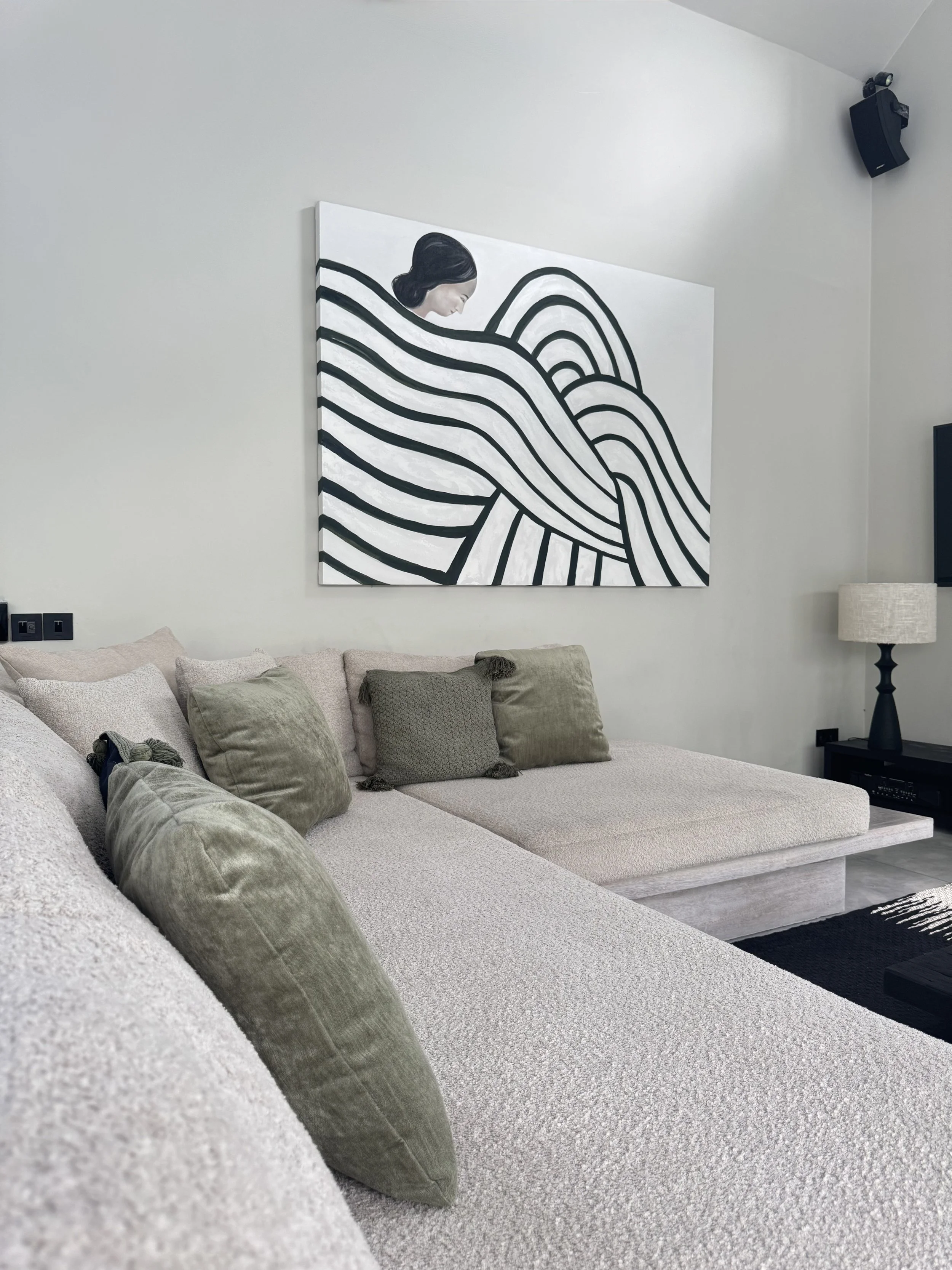 We built a striking foundation of polished concrete floors and a bold black kitchen, creating a modern industrial canvas. This was warmed with bouclé fabrics and a greige color palette, then brought to life with vibrant art on canvas and tropical green accents. The seamless integration of indoor and outdoor spaces allows the lush garden to become a living part of the interior.